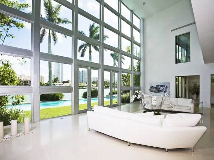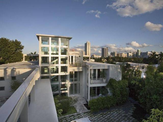 Sited on teardrop-shaped La Gorce Island, the three-story abode—accompanied by120 feet of private waterfront—is an awesome amalgam of glass, marble, and steel.The spectacular single-family boasts 10 baths and nine bedrooms, including a breathtaking two-level master suite accessible by a glass elevator and a three-bedroom guesthouse.