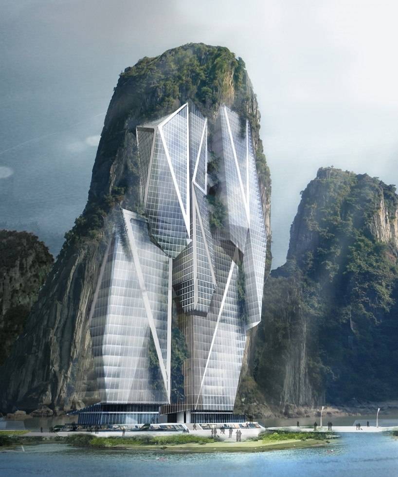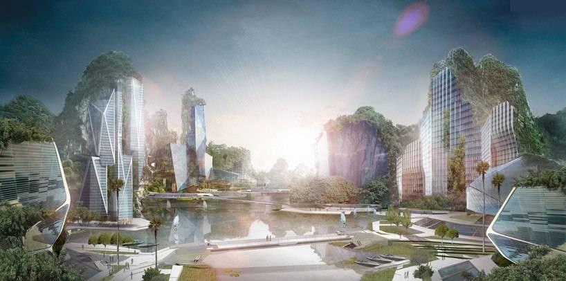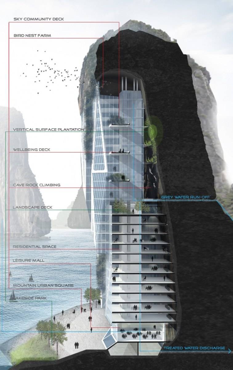 Intriguing features of the mixed-use development include a sky community deck, a bird nest farm, a vertical surface plantation, and a cave rock climbing area: