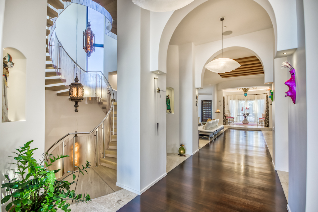 The garage of this home is fully air-conditioned independently w/ 2 large storage rooms. Designed to accommodate an INDOOR CAR WASH. The curved patio shower was designed for privacy & convenience, w/ beautiful Mediterranean blue tiles & a rain shower spa transports you to & from the Sea IL PARADISO is a beautifully designed and modernized Moroccan palace. The architectural design stemmed from a simple but thoughtful sketch drawn on an Intercontinental Bangkok Hotel notepad at 33, 000 feet in the air. The design is depicted by local artist, Allison Wickey’s original painting which is hung on the wall at the entrance of the home.