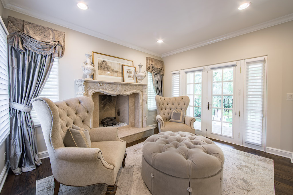 One example of this occurs in the estates’ master bedroom Sitting area. A tulip-style Roman shade was selected to complement the curvature of the Italian marble fireplace, and the pattern of the fabric coordinates with the carvings within the façade.