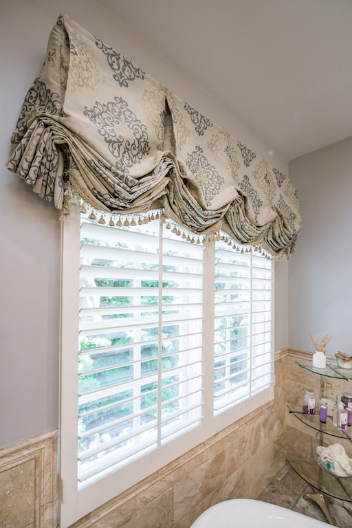 Selecting appropriately-proportioned patterns to use for window treatments also adds balance to the home’s architecture. The fabric for the master bathroom valance was selected in neutral tones not only because it coordinates with the style of the master bedroom, but this fabric compliments all of the details found throughout the entire master suite. A classic shutter-style window covering was installed for privacy and added another layer to the architecture from the interior as well as the exterior.