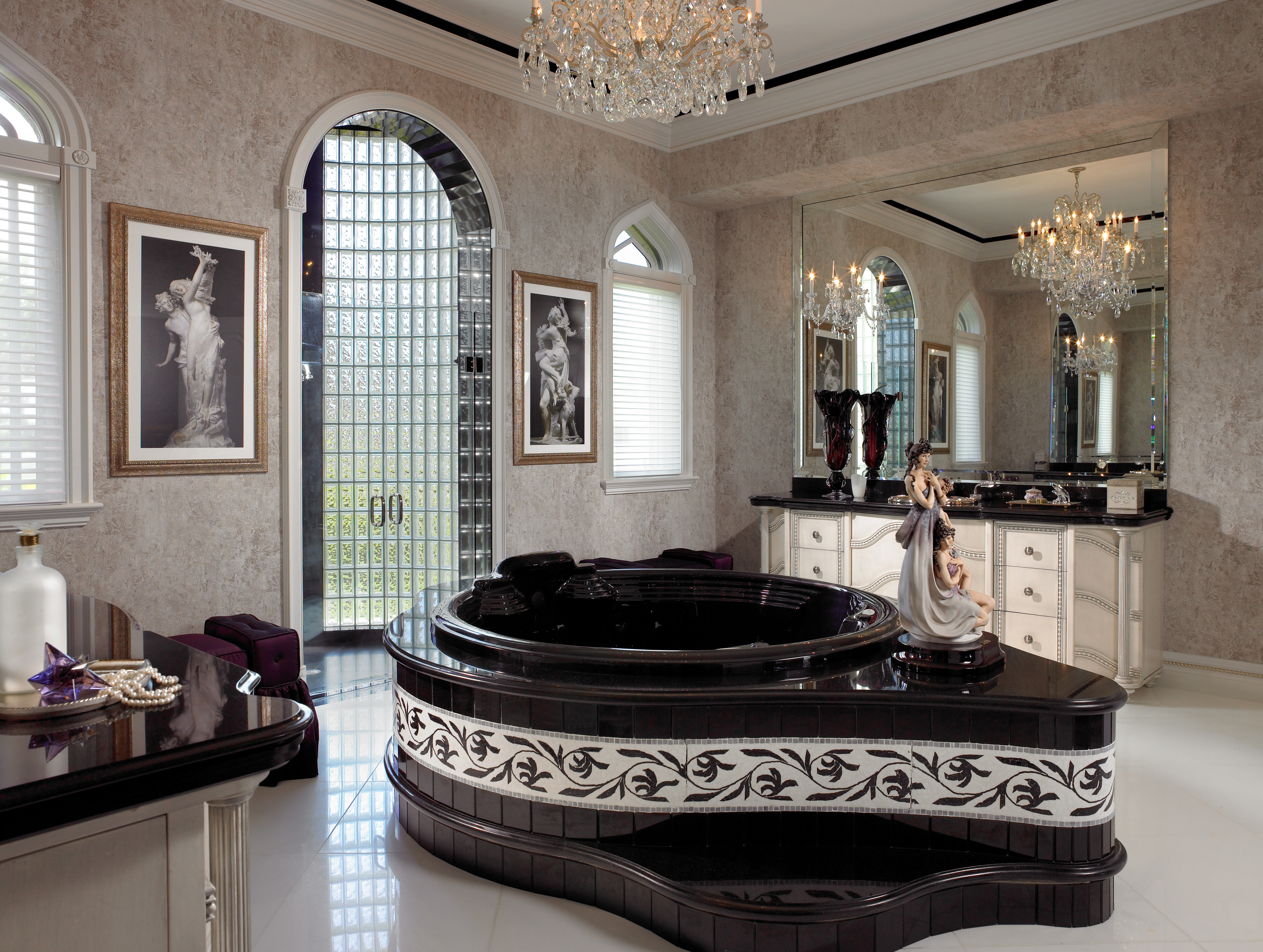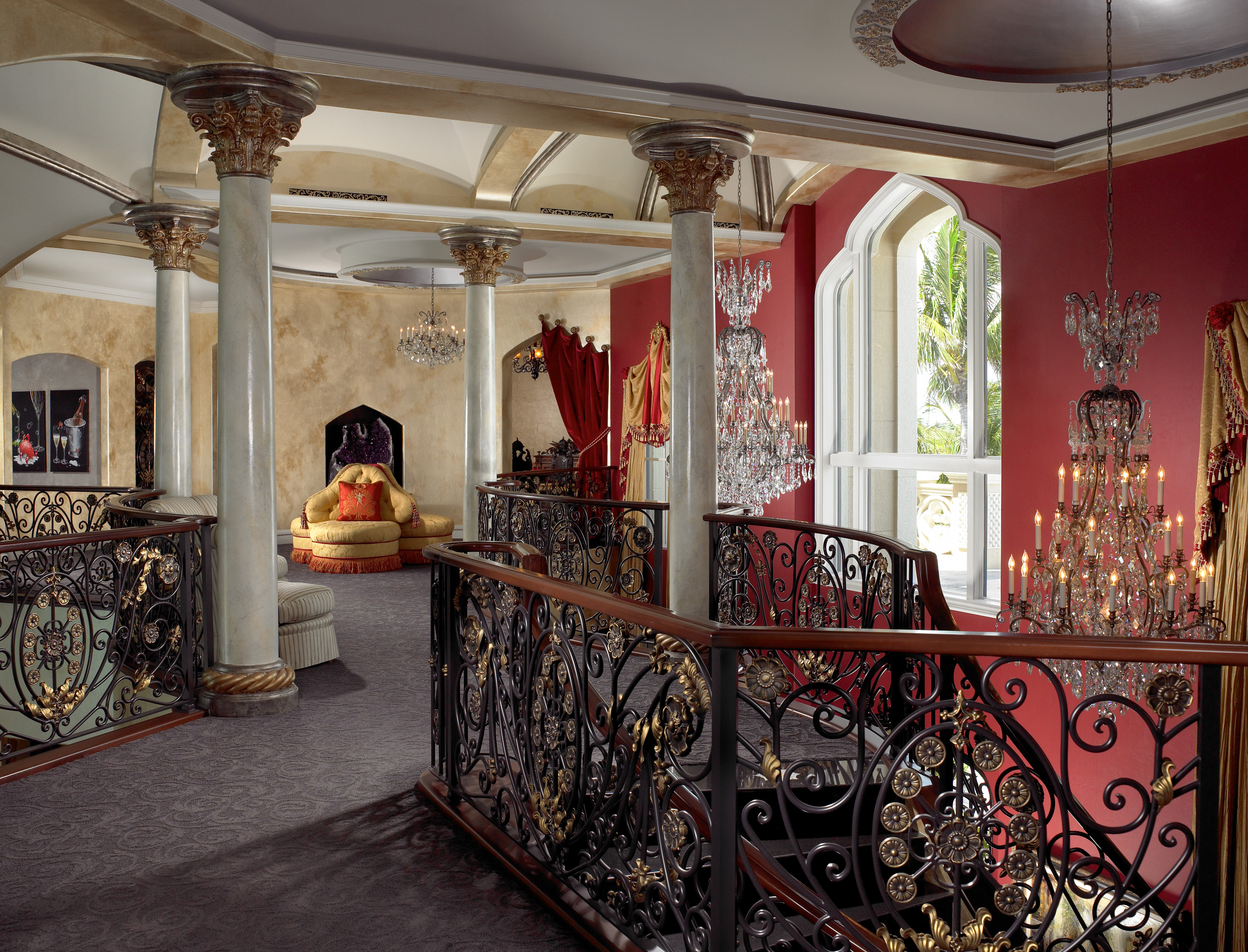 The 24,000-square-foot main residence’s master suite has a hand-painted ceiling mural, multiple double-hung windows with arched tops, silver and gold custom-carved columns, and an iron spiral staircase, while the formal dining room has seating for eight, a 14-Karat gold leaf ceiling, and a crystal chandelier. The gourmet kitchen is accompanied by Sub-Zero and Thermador appliances.