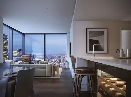 Another is a Foster + Partners-designed tower at the adjacent South Quay Plaza development. The 68-story tower will rise to 722 feet and be built at a 45-degree rotation to maximize water views and dual aspects. Each apartment will also have floor-to-ceiling glazing. Prices start from £599,950 ($862,900). As part of the project Berkeley Homes is also building a smaller 36-story tower and cafes, shops, restaurants, and a new dockside promenade.