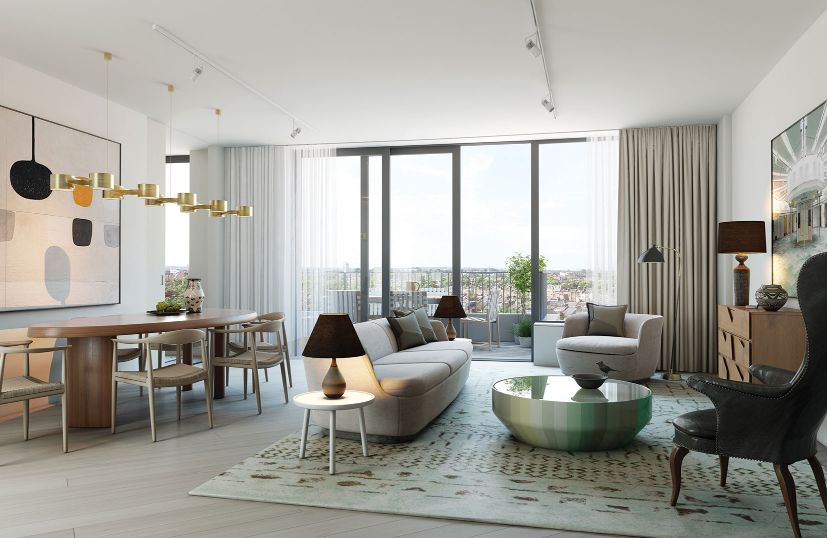 new homes, shops, and an office hub for media- related companies. As part of the revival, London developer Stanhope is converting the former BBC headquarters into luxury residences. Most of the apartments at the Television Centre will be inside the curving 1950s building shaped around a circular rotunda known as “the doughnut.” One-bedroom units start at £650,000, ($934,900) while the five penthouses, priced up to £7 million ($10 million), are located at the top of the building next to a Soho House rooftop pool and bar while overlooking a public piazza.