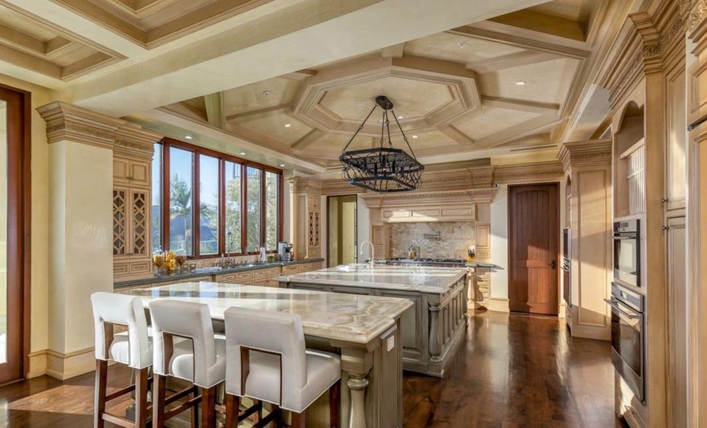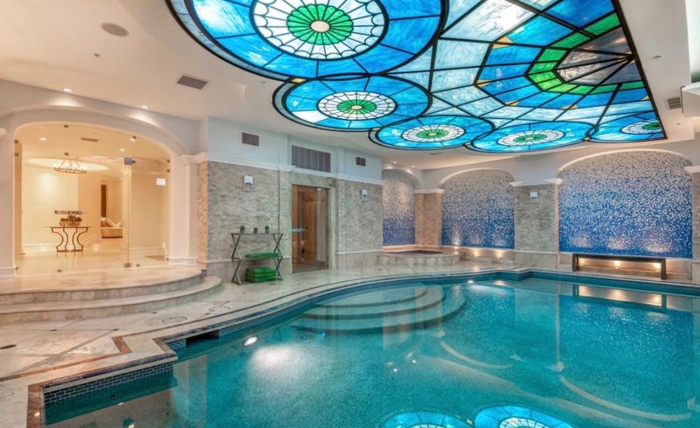 This Tuscan-style villa embodies European details of villas on Lake Como, from arched doorways and custom woodwork to ornate carved stone moldings and stained glass windows. Finishes include detailed crown moldings, imported marble, hardwood floors, Corinthian columns, high ceilings and rare stones in its baths and countertops. The residence includes a state-of-the-art home theater, billiard room, glass-enclosed wine cellar, 7 fireplaces, and 3 pools. An indoor pool and spa, inspired by ancient Roman baths, features mosaic tiling, state-of-the-art lighting and stained glass skylights.