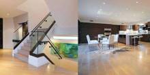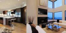 The home’s current color scheme is minimalistic, offering white and back finishes, glass railings and glass/metal staircases (including a very attractive backyard spiral staircase). The apartment’s kitchen also boasts a modern design, offering seamless cabinets and a center island.