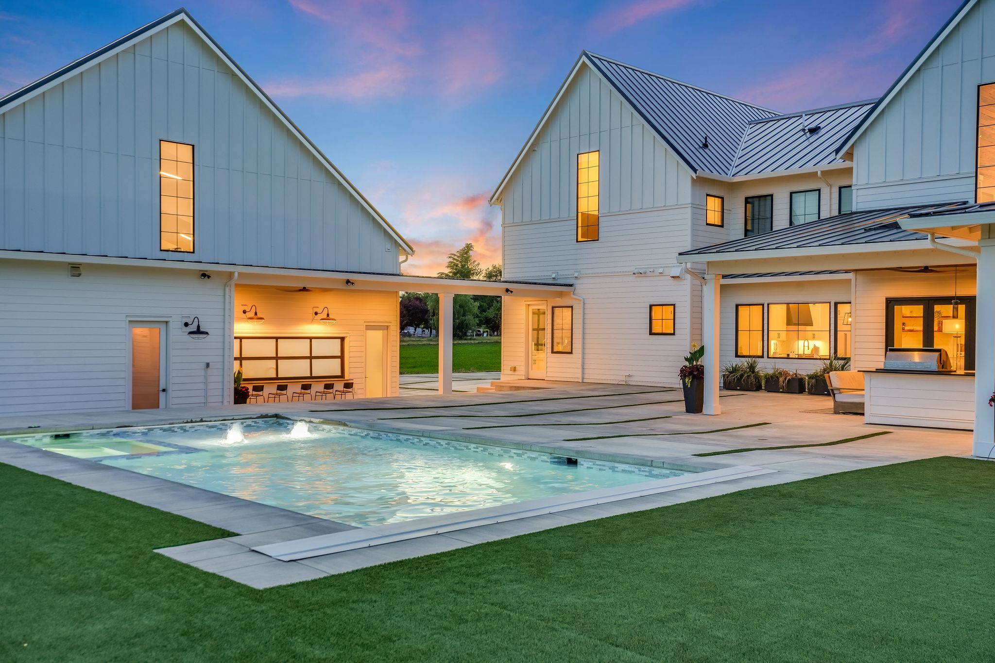 This house was absolutely built for entertaining and has already hosted a wedding in the little over a year since construction was completed. The outdoor space feels like a five-star resort with an inviting Neptune pool and spa with an Intellichem chemical control system, automatic cover, and LED lights. The covered patio features a gas fireplace and a built-in 36-inch Lynx Sedona grill. The ceiling here and outside the primary suite are plumbed for heaters. The yard is no-maintenance turf and the lush landscaping surrounding the property was done by Dennis’ 7 Dees with a zone drip irrigation system and lighting. The adjacent shop is 3,400 sq feet with three bays including an RV height space with a pull-through for easy maneuvering. The side of the shop that faces the pool and terrace features a glass panel garage door that opens to a bar area that connects to the house via a covered breezeway. The full pool bath is also located in the shop close to a space that is currently in use as a home gym.