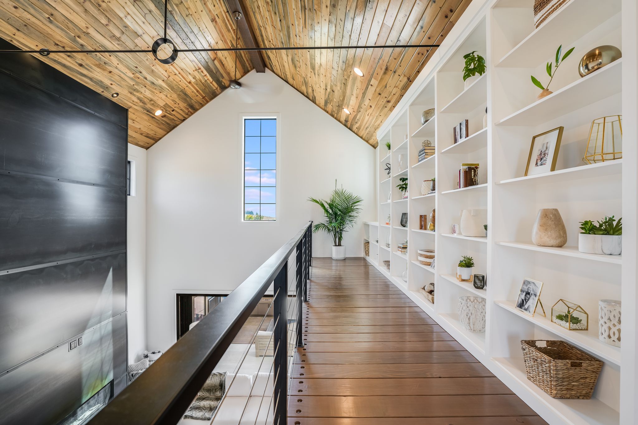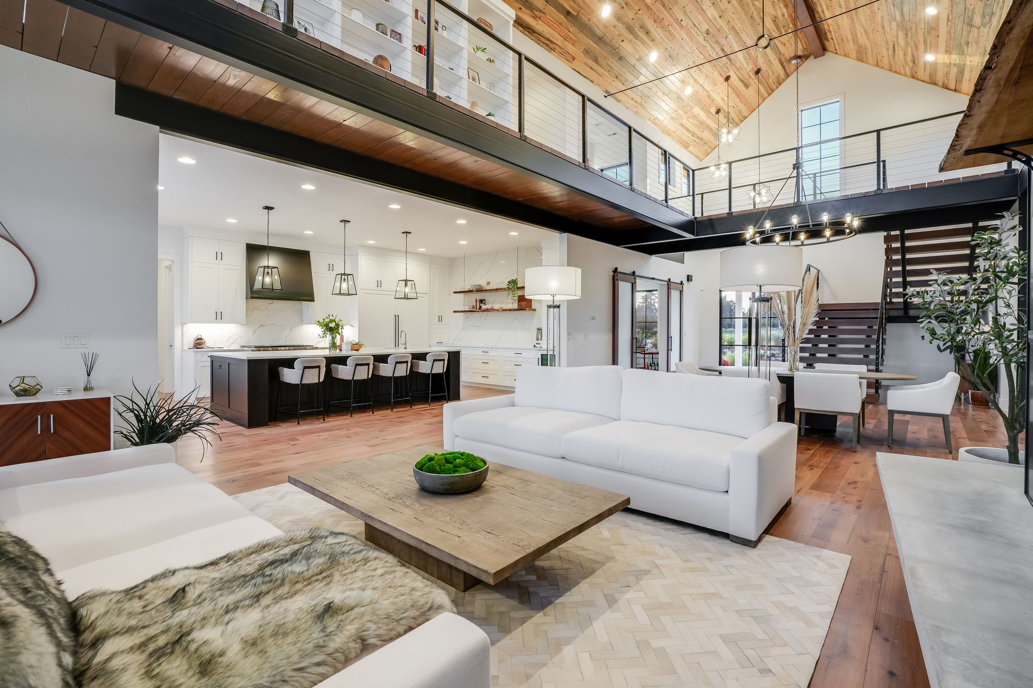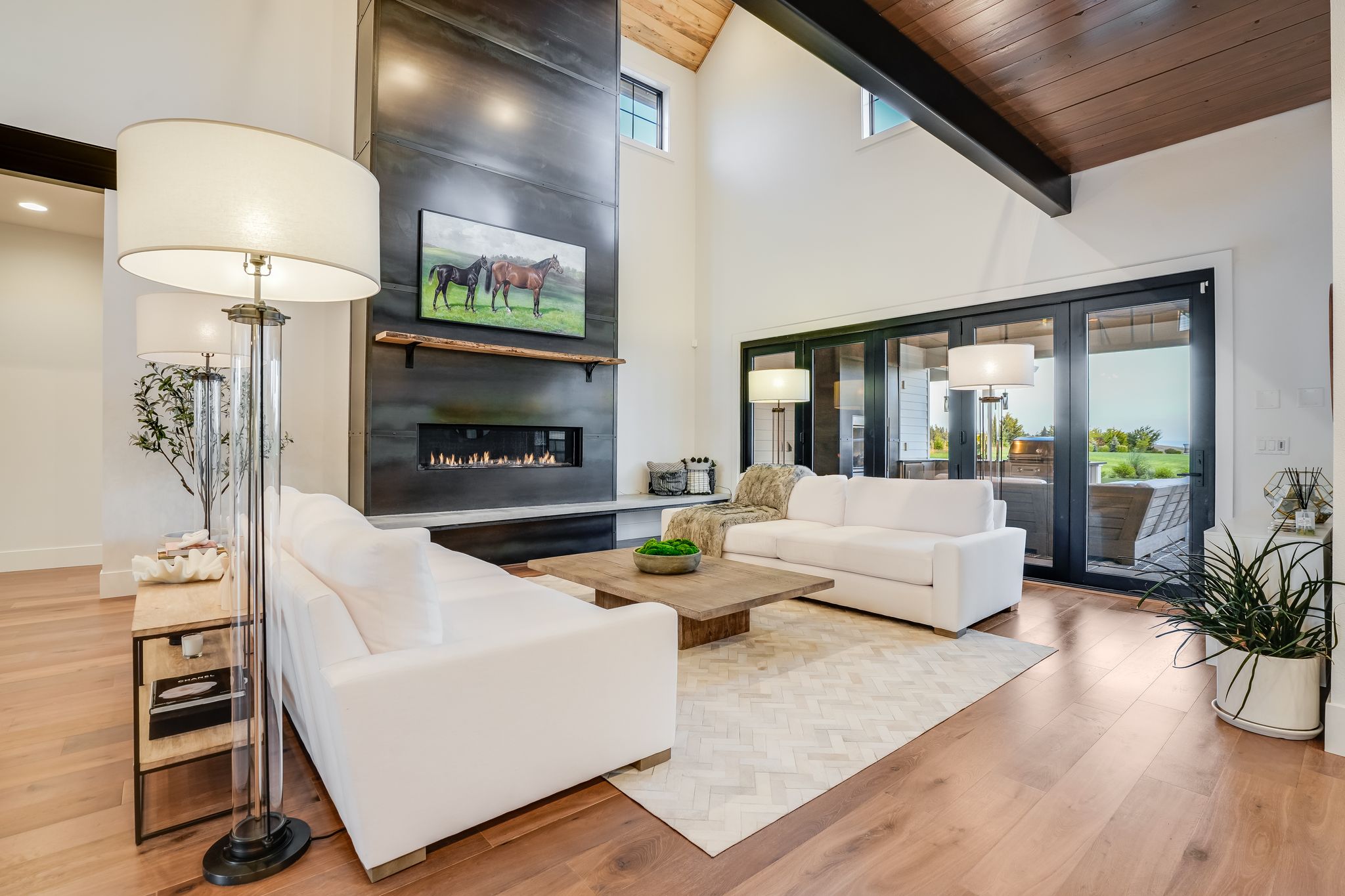 Step inside the impressive Pinky’s Iron Doors glass and metal front doors into the open and airy main floor where a cathedral ceiling clad in hard-to-find blue pine sourced from Central Oregon soars overhead. Three ornamental turnbuckles span the ceiling adding a classic farmhouse touch. The floating staircase of steel and wood extends up to the second floor where a catwalk overlooks the great room below. This open space is defined by a stunning RH light fixture that hangs over the dining table and the moody steel ceiling-height surround of the Montigo gas fireplace. Wide-plank engineered floors span the room. A wall of accordion doors frames the view of the property and opens to the outdoor space.