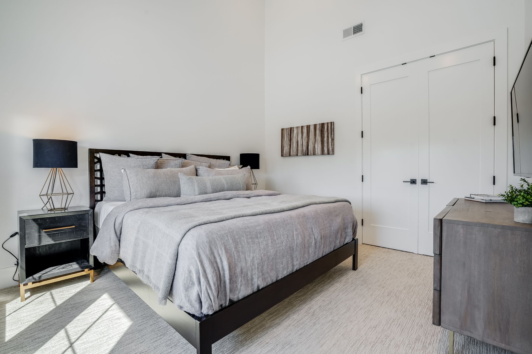 The luxurious primary suite is conveniently located on the main floor. With a 12 ft. Pinky’s Iron bifold door leading out to a private patio, the primary suite is a peaceful sanctuary. The ensuite bath is large and luxurious, separated from the bedroom with a barn door. Heated tile floors, floating vanities, and a gorgeous freestanding tub give the bath a sumptuous atmosphere. The oversized shower has a rain shower head, two additional shower heads, and a handheld spray. The walk-in closet is perfectly finished with a glittering RH chandelier, storage, and display cabinets. Also on the main floor is a media room with custom-made barn doors that separate it from the foyer.