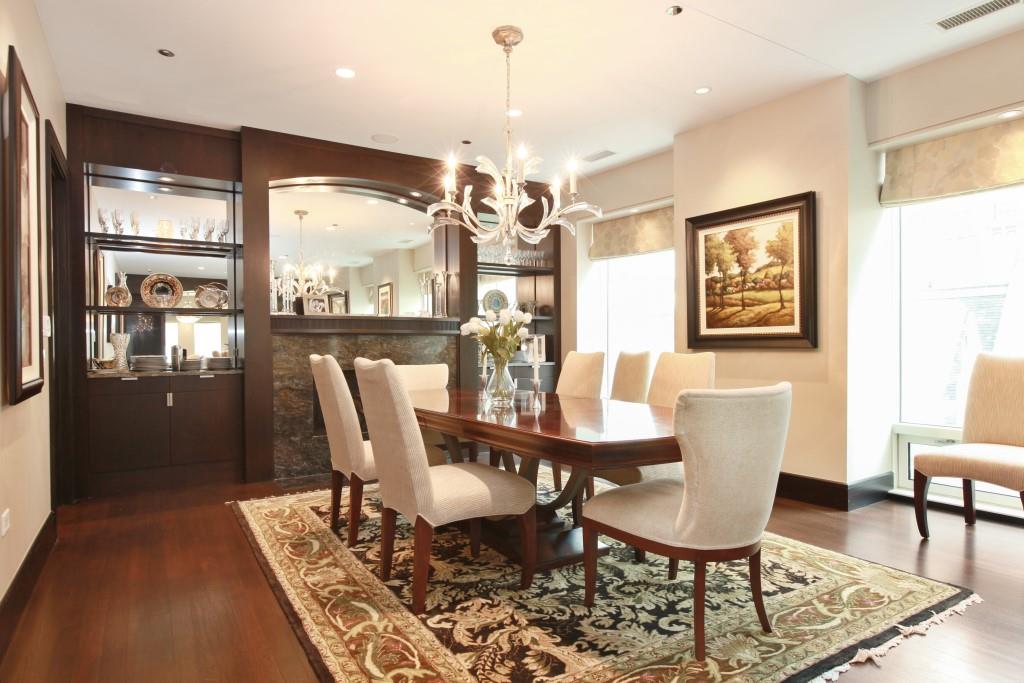 The dining room is inviting and perfect for the intimate dinner party. Highlighted by a beautiful chandelier, the dining room also features a gas fireplace and built-in shelving with cabinets.