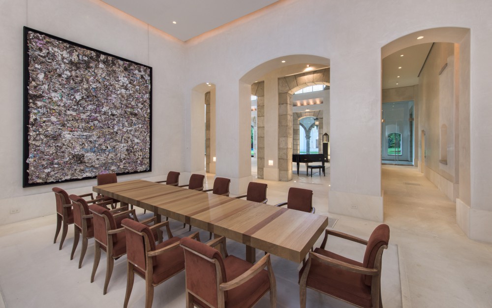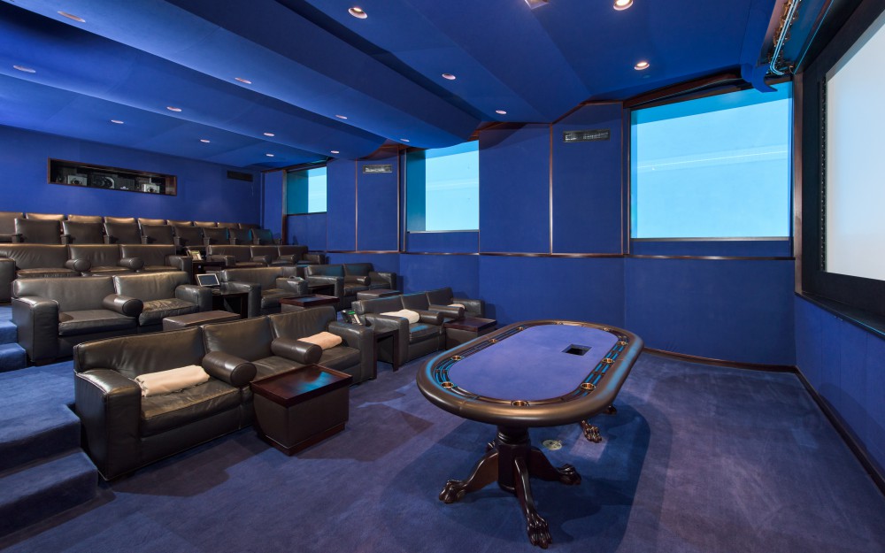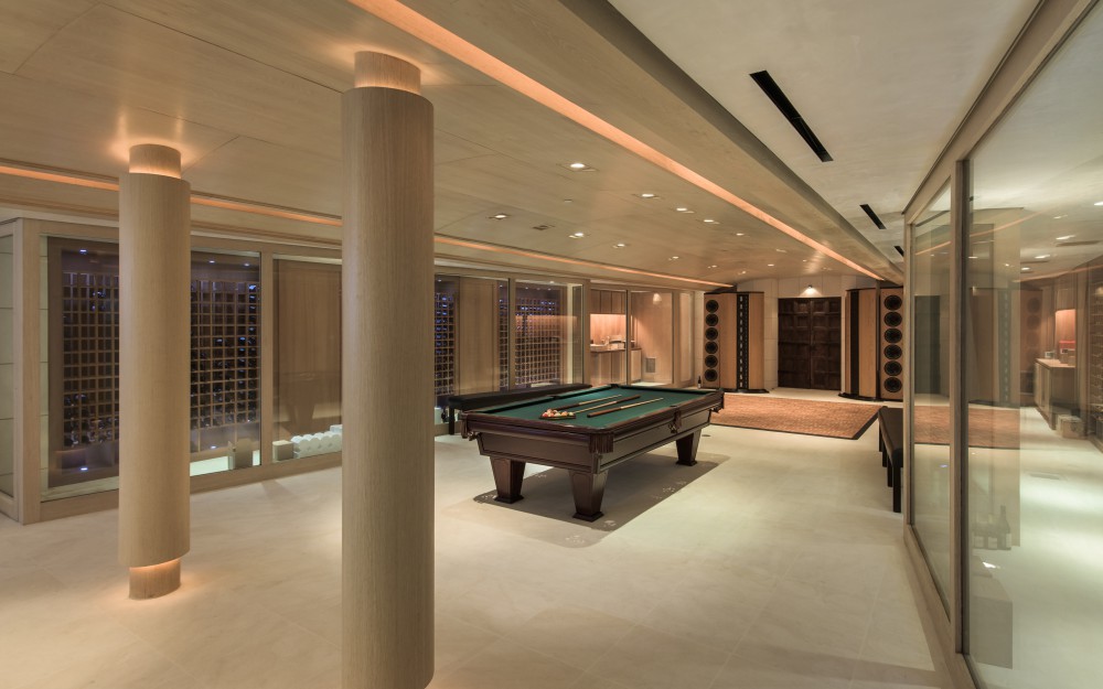 With all of its grandeur and scale, the Mapleton Estate includes seven bedrooms, two staff, and a three story guesthouse. Enter through heavy carved wooden doors from a Spanish monastery, and into a soaring atrium with 30-foot ceilings from which all other rooms branch. The famed art-deco inspired library is one of the single best rooms in all of Los Angeles. 400-year-old Moorish columns, 16th and 17th century Florentine ceilings, a rooftop terrace that frames panoramic city views and an entirely subterranean waterproof cinema with large windows reveal a stark-aqua swimming pool.