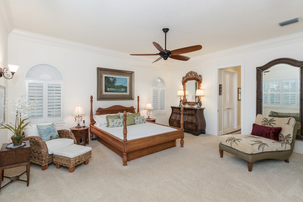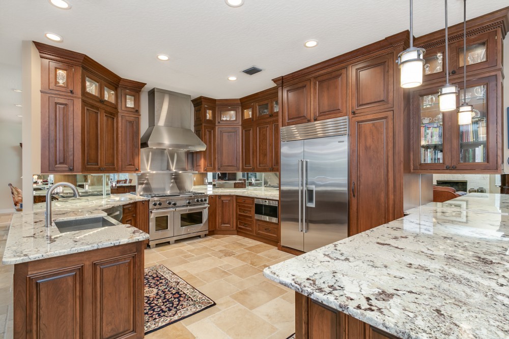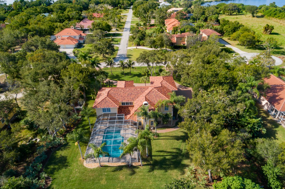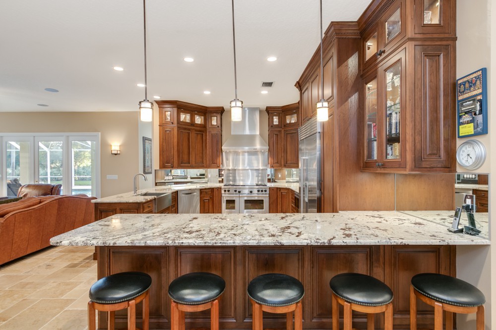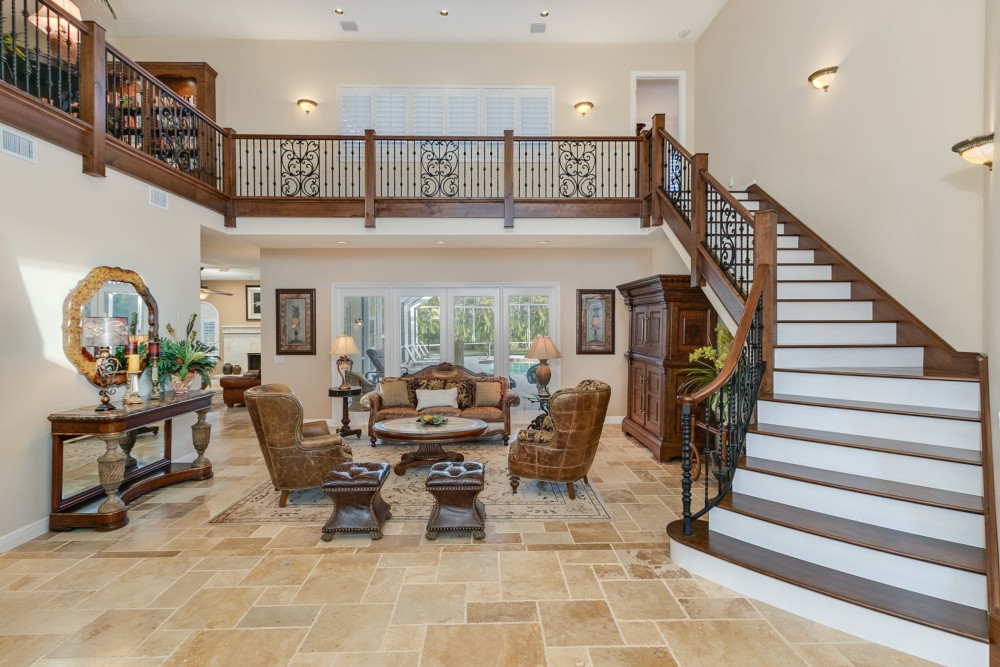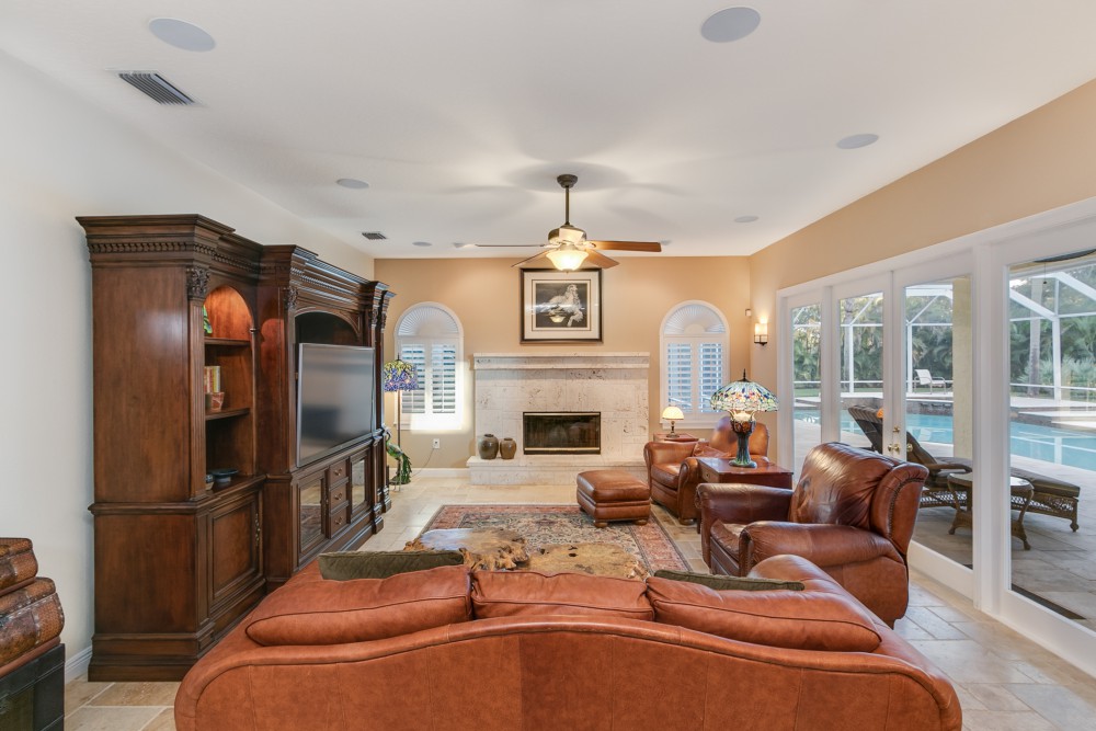 This luxurious, Tuscan inspired two story, 4 bedroom, 4.5 bath home is sure to captivate any who enter via the travertine tiled porch into the 2 story foyer. This lovely home boasts 5336 square feet of living area w/impressive 20′ ceilings, formal dining & living rooms & a coquina surround, wood burning fireplace. The Chef’s kitchen is an inspiration for the gourmet in all of us with its custom designs: stainless Wolf double oven, flat top griddle & grill inserts, Crystal line solid cherry wood cabinets w/hand blown glass inserts & LED lighting. The grand staircase leads to the second level Master Suite, loft library retreat, game room/second family room & work room. Tinted windows w/plantation shutters. The screened patio has travertine pavers surrounding the salt water pool & spa nestled beneath lush, mature shade trees on expansive lawn.
