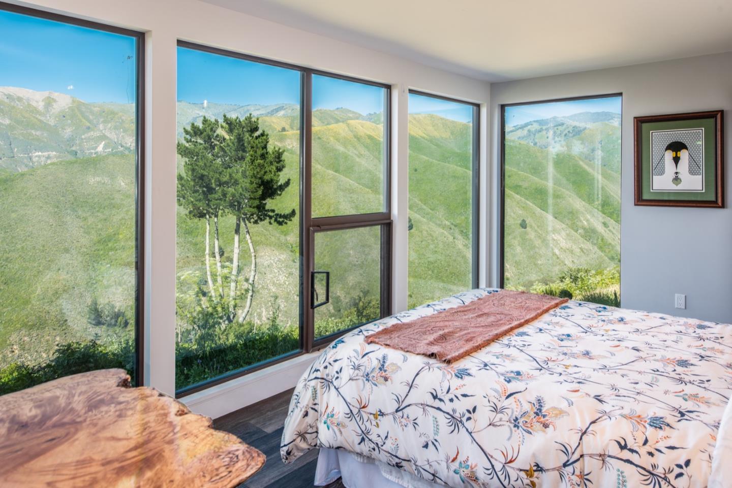 The main house has four bedrooms all with incomparable views towards the verdant majestic coastal mountains and the Pacific. Plus there is an additional one-room guest cottage that is private with views down the canyon creek and up the jagged coastline.