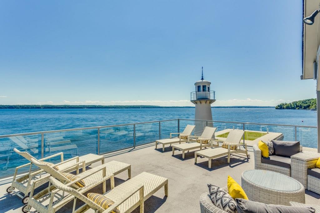 Stately English oaks line a stone pathway or follow the original stone steps to an exclusive 525-foot frontage private beach graced by sweeping willow trees. A glass-enclosed boat house and deck showcase captivating panoramic views of Kempenfelt Bay. The landmark lighthouse serves as a beacon to beckon you home after a day on the shimmering lake waters that offer endless opportunities for fishing and boating. A veritable masterpiece, this is truly one-of-a kind.