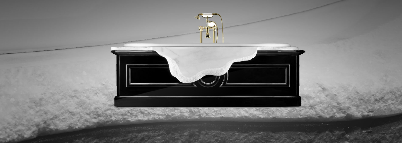 Blending Ibiza marble and wood, this bathtub draws inspiration from the ancient city of Petra. Matching the visual uniqueness of the stone city, the tub combines glossed wood and disparate shades of white in a luxurious look.