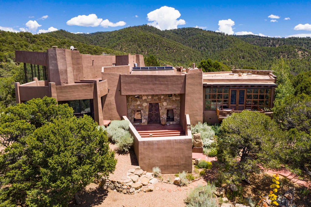 At eight thousand feet, stunning vistas unfold from this mountain retreat on 64 acres, which comprises a main house and a casita connected via a zaguan, offering four bedrooms and five baths, all just five miles from the Santa Fe Plaza.