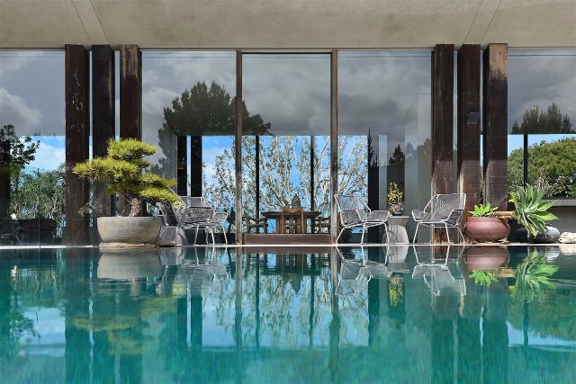 Welcome to Brushstroke, where timeless elegance and the iconic contemporary architecture of Wallace Cunningham converge to create an unparalleled work of art. Walled and gated providing an exceptional level of privacy, this distinctive residence rests in an extraordinary 1.3-acre setting surrounded by beautifully landscaped grounds and romantic gardens overlooking the Pacific Ocean. Aesthetically pleasing in every regard, the spectacular, single-level floor plan is sophisticated yet simplistic in its design. A dramatic, curvilinear roofline, hand-tinted plaster walls, and floor-to-ceiling walls of glass flanked by 100-year-old reclaimed redwood beams contribute to the Zen ambiance and evoke the feeling of being at one with the environment. French limestone flooring found throughout the interior extends to the expansive decks encompassing the home. Exceptional living areas, highlighted by a floating fireplace, separate the magnificent master suite with an office from the two secondary bedrooms.