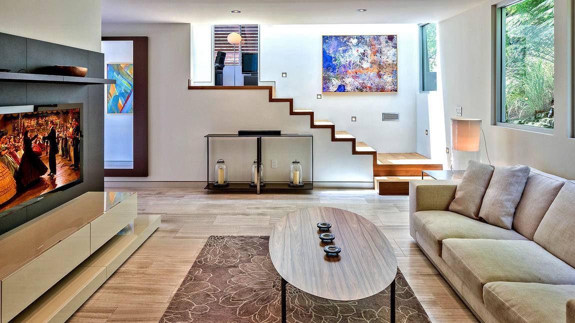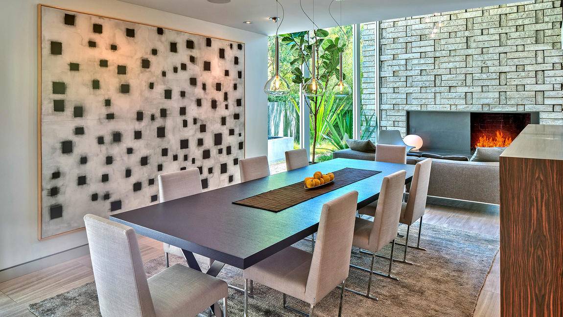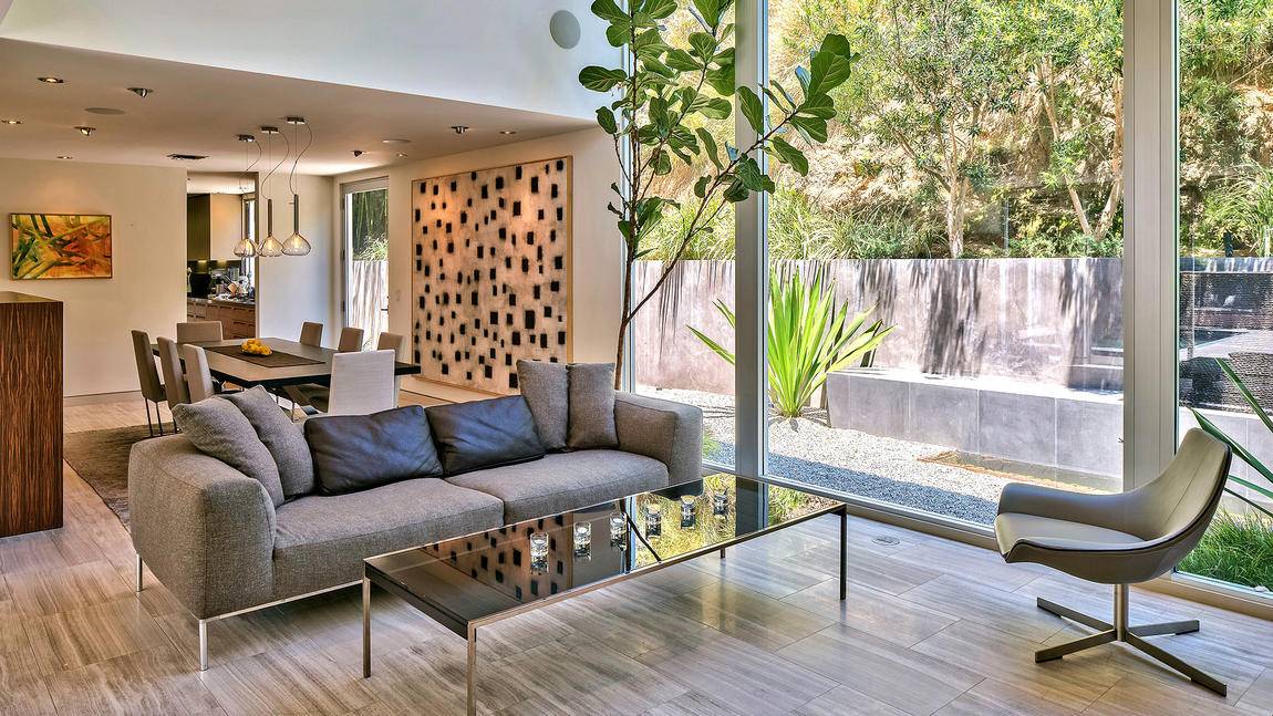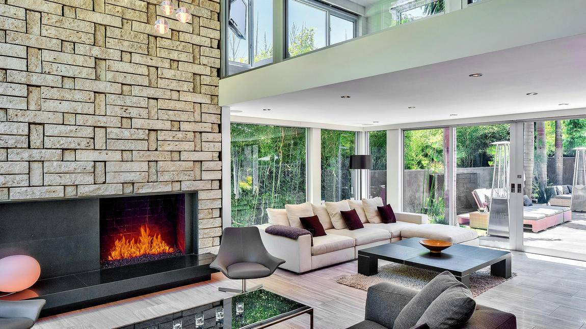 Known as the Honnold & Rex Research House, the 3,700-square-foot, four-bedroom, four-(marble) bath home touts walls of glass that open to a courtyard and spa, while its two-story living room is highlighted by a floor-to-ceiling stone wall and fireplace.