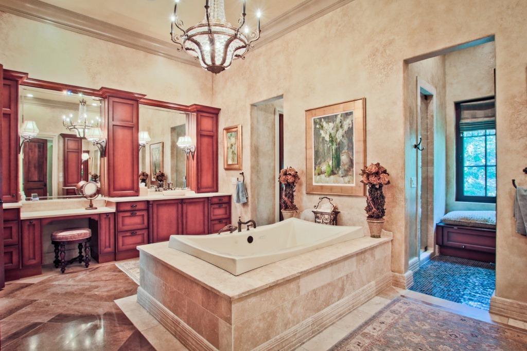 The master suite is on the main level and opens to the pool. It features his and her baths and dressing rooms.
