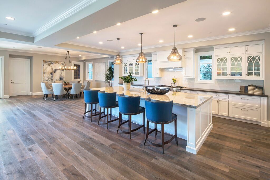 Wide plank solid wood flooring abounds, punctuated by the use of rare stone counters and backsplashes, and complimented by floor to ceiling wainscoting.