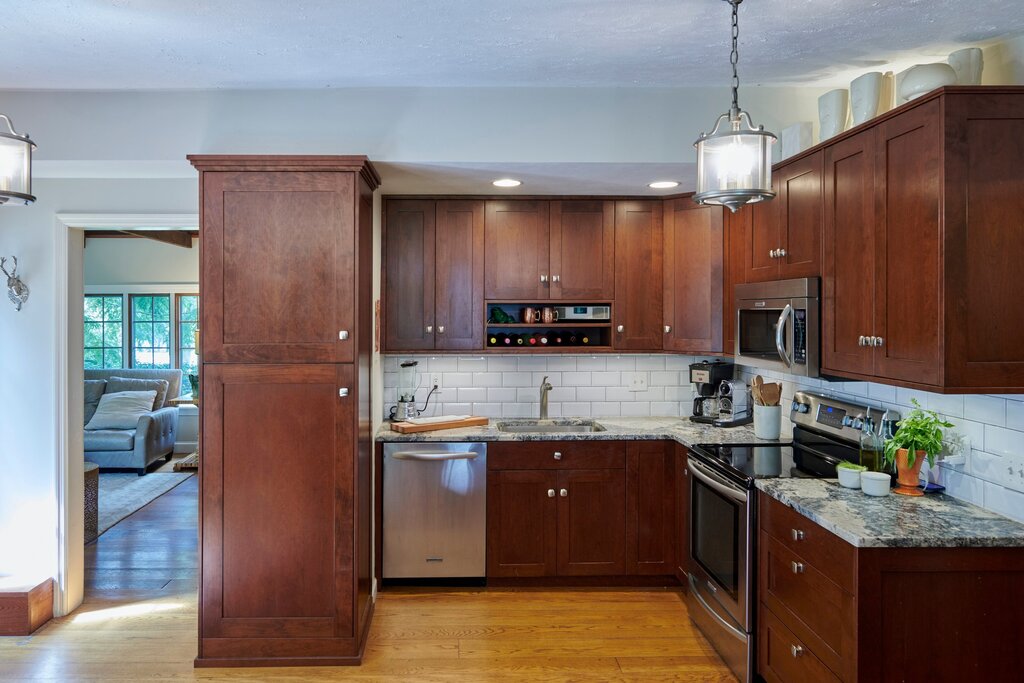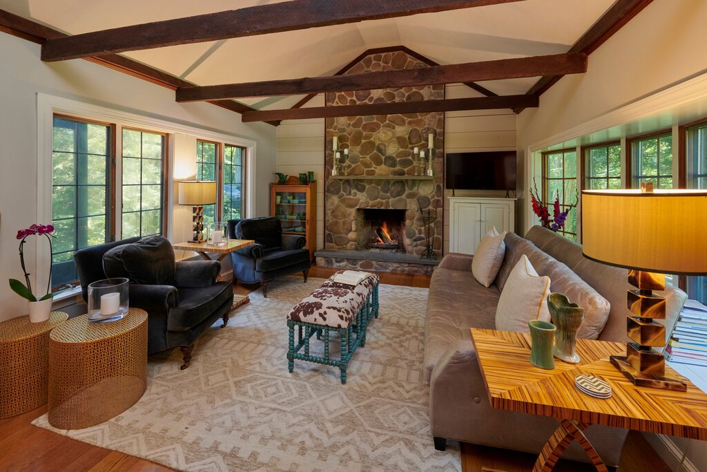 The heart of this sanctuary is the bright and spacious living area, adorned with large windows that allow nature’s artwork to flood the space with sunlight. The stone fireplace, hardwood floors, and exposed beams evoke a sense of warmth and character. The layout effortlessly connects the living room, dining area, and gourmet kitchen, making it an ideal space for family gatherings or entertaining friends.