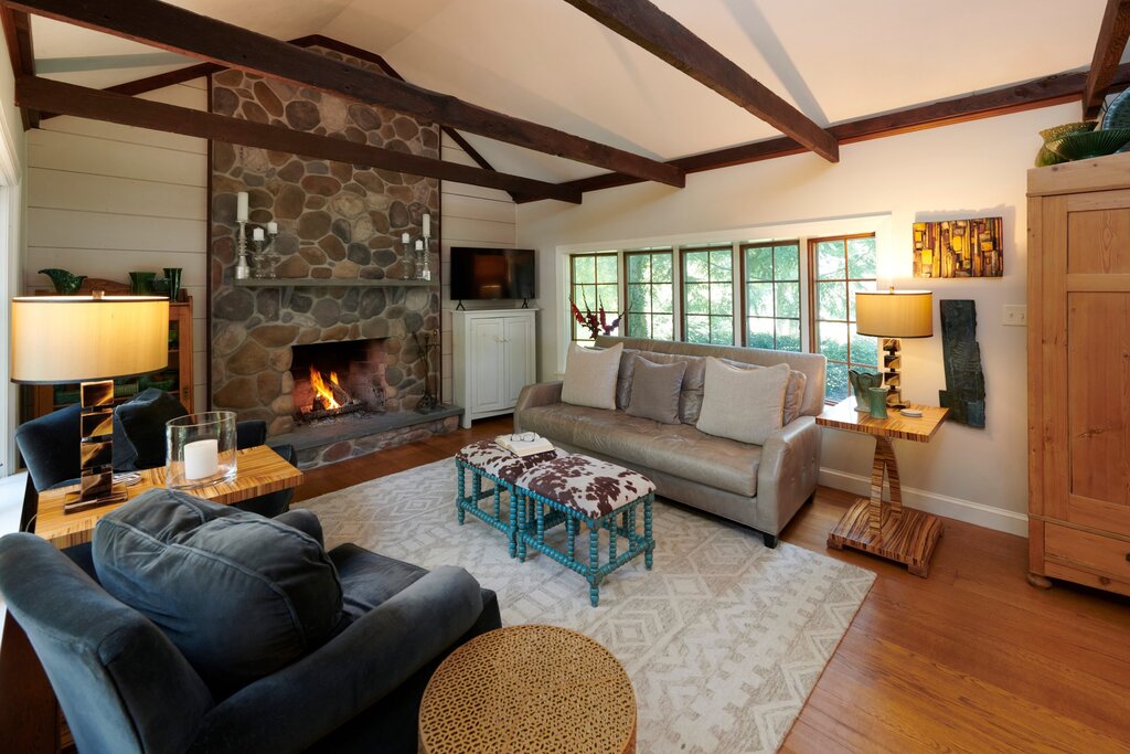 The heart of this sanctuary is the bright and spacious living area, adorned with large windows that allow nature’s artwork to flood the space with sunlight. The stone fireplace, hardwood floors, and exposed beams evoke a sense of warmth and character. The layout effortlessly connects the living room, dining area, and gourmet kitchen, making it an ideal space for family gatherings or entertaining friends.