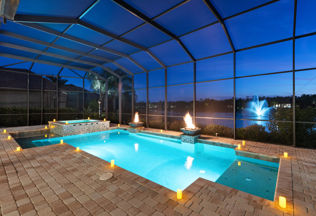 Situated on a corner lot, offered furnished with desirable SW exposure for all-day sunlight and lovely lake views. The light, bright, beautifully decorated interior features soaring tray and volume ceilings, crown molding, art niches and cutouts, custom light fixtures, plantation shutters, wood-look tile floors, Sonos sound system, and impact glass windows and doors. The open great room connects the gourmet kitchen and formal dining area with an adjacent wet bar. The kitchen boasts GE stainless steel appliances, gas cooking, mosaic tile backsplash, custom pantry cabinets, granite counters, island with breakfast bar, plus a breakfast nook with bay window overlooking lanai and pool. Luxurious master suite with private lanai access, dual walk-in closets, en suite with granite countertops, dual sinks, jetted tub, travertine tile shower, and enclosed WC. Entertain with ease, there’s a fabulous outdoor living area, huge lanai, inviting pool and spa with waterfalls, fire bowls, fire pit, and serene lake and fountain views. 3-car garage and lush landscaping round out this amazing home.