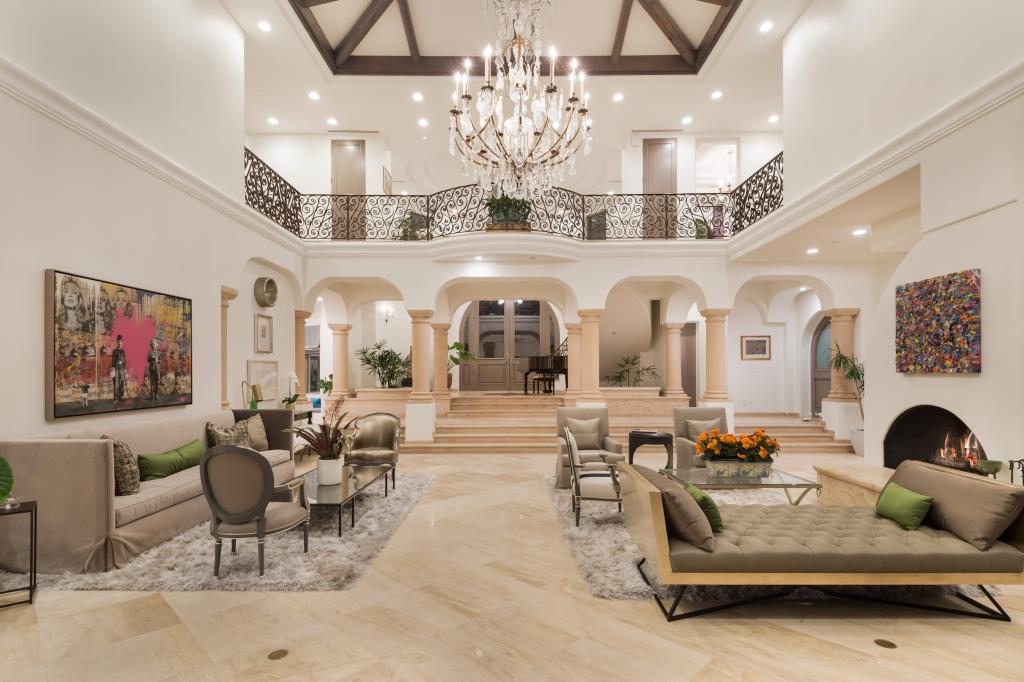 Built by prominent architect, Dan Lang, the spacious interior has a vast, open concept design. Upon entrance, the villa meets you with thirty-one feet high ceilings, an opulent entry with a spiral staircase, and an expansive living space that melts effortlessly into the outdoor living area and infinity pool.