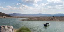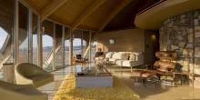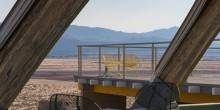 The two-bedroom, two-bathroom home with its spaceship-like design has high ceilings, an open floor plan, a collection of large sliding glass doors, and a viewing deck that surrounds the desert pad and offers amazing 360-degree views of the nearby mountains and lake.