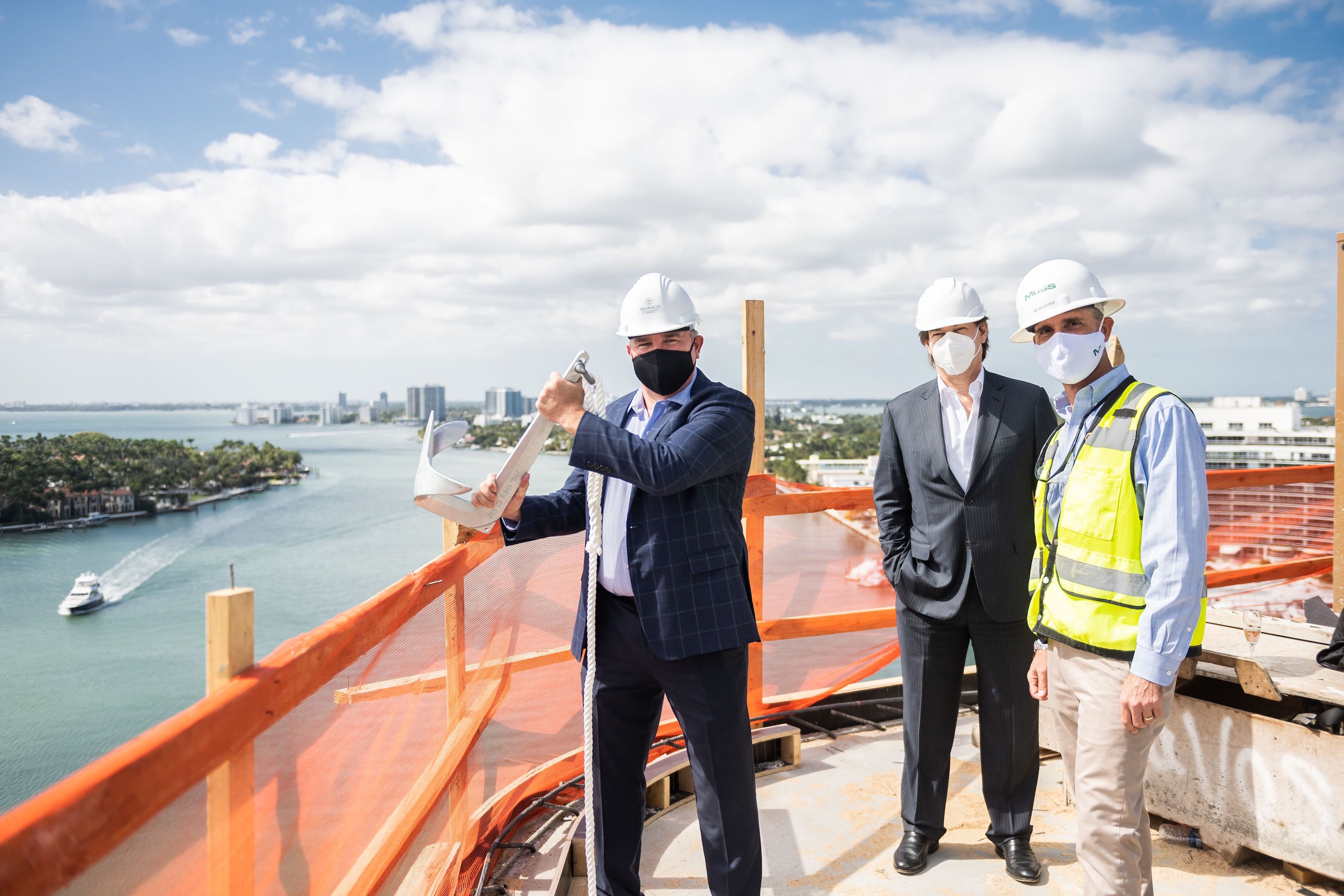 To commemorate the topping off, the development team — including Matthew Barry, Managing Director of Optimum Asset Management USA; Jamie Telchin, Executive Director of Optimum Asset Management USA; Edgardo Defortuna, President and CEO of Fortune International Group; and Andrew McAllister, Co-President of Moss Construction South Florida — took to the top of the building, where they popped champagne and posed for photos against a dramatic background of Biscayne Bay and the city skyline. Moss Construction additionally hosted a celebratory lunch for 250 of the company’s construction workers, engineers, and other contractors who have been instrumental in the tower’s rise.