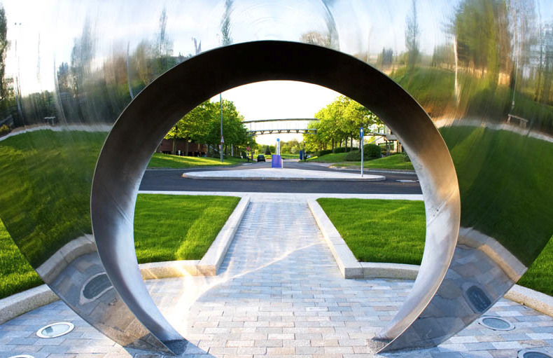 Moongate, a sculpture by Allison Armour, features a bold design that serves as a centerpiece of Frimley Park in Frimley, Surrey, UK. Spanning fifteen feet in diameter, this sculpture is crafted from mirror-polished stainless steel and needed an oversized truck with a police escort for transport.