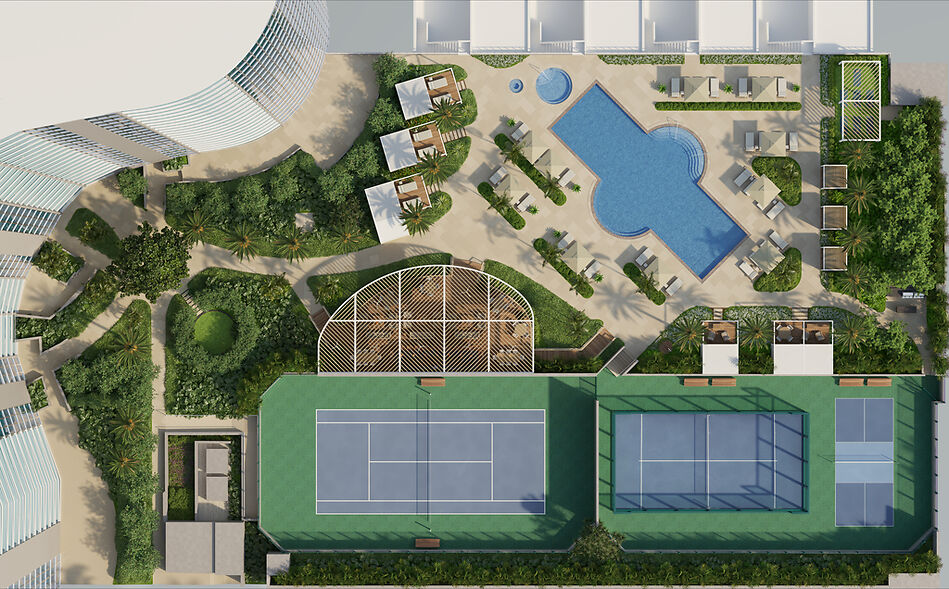 In a first for South of Fifth, Murano will introduce a fully integrated racquet sports club, housing tennis, pickleball, and padel courts under one roof. Accessed just below the pool deck, the facility will be enveloped in greenery, blending athletic performance with resort aesthetics.