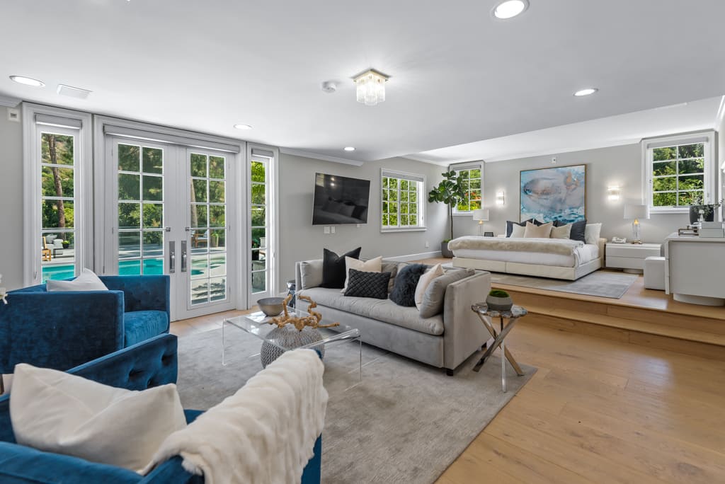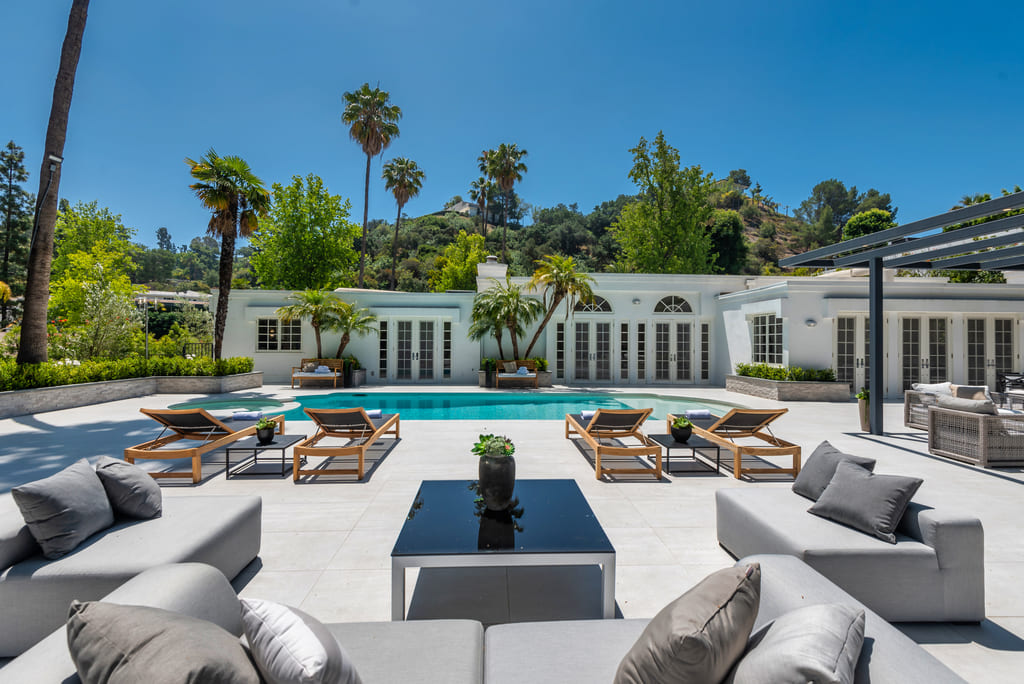 Situated in prestigious Trousdale Estates, this single-story, hard-to-find Contemporary boasts 5,695 sf of beautiful living space. Open floor plan and fully equipped smart home with Control 4 features. Over-sized public spaces are highlighted by floor-to-ceiling French doors overlooking a sprawling outdoor area. A well-appointed living room with a grand fireplace opens to dining with a full-service bar and a large family room with a fireplace all of which are bathed in natural light. Light and bright breakfast room and gourmet kitchen featuring stainless steel appliances and a center island with plenty of counter space and cabinetry. The luxurious principal suite offers dual sinks, separate walk-in closets, a steam shower, jetted spa tub, sauna, and 2 toilets – one with a bidet. Two ensuite bedrooms adjoin seamlessly to share a lovely sitting area with a fireplace. Two additional guest suites, laundry room, large motor court with 2-car garage. Enjoy the ultimate California outdoor lifestyle with white stone patios overlooking lush mountain views, a gorgeous sparkling swimming pool with spa and pergola. Come home to your own resort!