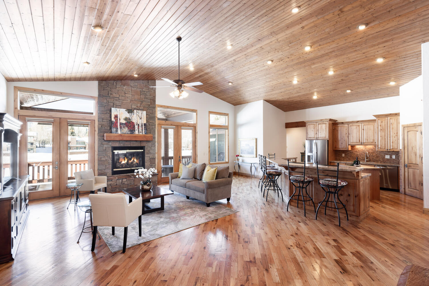 Backing to the third fairway of the Jeremy Ranch Golf & Country Club, this mountain modern home exudes privacy & views. Inside, an abundance of charming living/entertaining spaces unfold, beginning with a generous great room that flaunts a vaulted ceiling, gas fireplace, and oversize windows that frame the stunning views. In the open-concept kitchen, granite countertops, a large island with seating for eight, a walk-in pantry, and a stainless appliance suite make mealtime a communal affair. The main level also features an informal dining space, powder room, and a covered back deck. (Motorized blinds included for bluebird days.) This home’s private quarters are all on the main level, including two secondary bedrooms linked by a Jack-and-Jill bath and a spacious primary complete with a double-sided fireplace, a custom walk-in closet, deck access, and a spa-like en-suite bath. If spreading out is more your style, this home’s lower level doesn’t disappoint. Here, a huge family room presents high ceilings, a fireplace, a second kitchen, three bedrooms, two baths, and yet another outdoor space: a covered patio with the option for a hot tub. Hardwood floors throughout the main level, an electric fence, central air, surplus storage, and a 3-car garage with epoxy floors and an electric car charger round out this home’s enviable amenities.