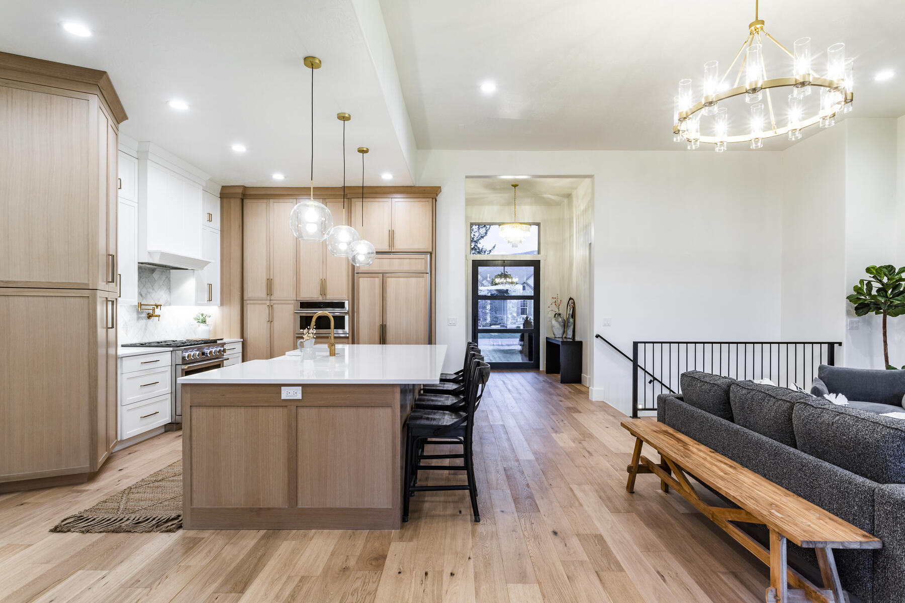 Imagine the ultimate combination of rural living on a family-friendly cul-de-sac. This home, situated on an acre with east and west-facing views of mountains & pastures was completely gutted and remodeled in 2022. Enter through the oversized front door into a completely open living area with nine-foot, 4-panel, sliding glass doors to take advantage of the views. Exit the sliders to an expanded Trex deck. The remodel included new plank oak wood floors, carpet, base & case, lighting, doors, plumbing fixtures, and quartz on all main level countertops. The open great room is anchored by a wood-burning fireplace with a new surround, informal dining, and a new kitchen. Enter from your oversized 3-car garage into a brand-new mudroom with built-in seating & cubbies. The pristine new kitchen includes a GE Monogram appliance suite with two ovens, including one with convection & steam, all new cabinets with soft close doors, and a magnificent island. Completing the main level is the master suite, with a spa-like bath and walk-in closet, three additional bedrooms, two additional baths, and an office with built-in shelves and a barn door. The self-contained lower level has a separate entrance, full kitchen, family room, laundry room, home theater, gym, and three bedrooms plus 2 baths. Expansive, fully landscaped yard with automatic sprinkler system. In this part of Oakley City, an additional barn or structure is permitted on the property, as are up to 3 large animals and there are no vacation rental restrictions. This magnificent home is move-in ready for its next owner to immediately enjoy.