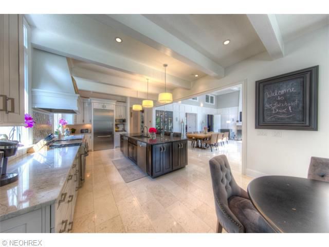 A hundred-year old imported Sevillano olive trees line the private drive. The 14-foot high entry foyer has antique Spanish-marble floors. Herringbone-patterned, natural-colored French oak floors cover the great room that’s anchored by an Italian Calacatta marble fireplace and wet bar.