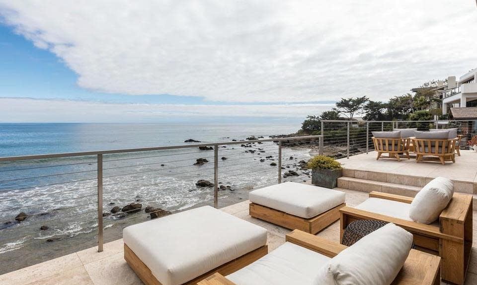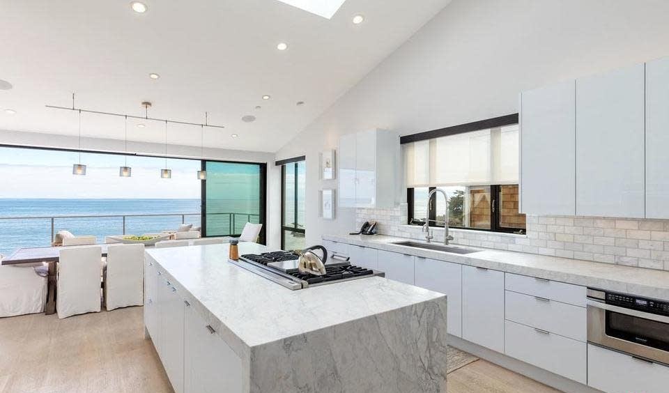The multi-level, open-floor-plan home features French oak floors and vaulted ceilings that stretch through six bedrooms and as many baths. A remodeled kitchen boasts Calcutta marble, while a media room accommodates a glass wine wall. A wet bar, a library, a gym, an elevator and an expansive patio with an outdoor spa complete the smart oceanside residence.
