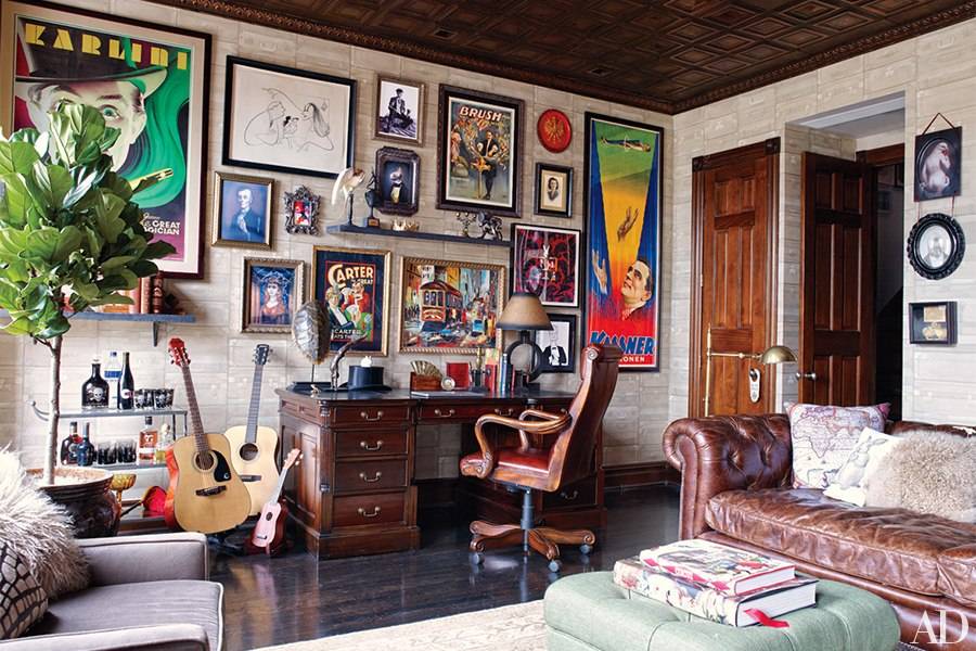 The artful den is covered in Andrew Martin wallpaper and embellished with playful memorabilia, and outfitted with a desk and chair by Arte de Mexico, and a sofa by RH. Two classic guitars—a Gibson (left) and a Jean Larrivée—add further character to the room.
