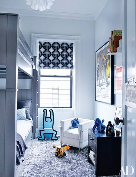 Gideon’s room features an RH Baby & Child bunk bed, along with a Flash Gordon lithograph, a Keith Haring chair by Vilac, a Roman shade made of DwellStudio fabric for Robert Allen, and a carpet by Safavieh.