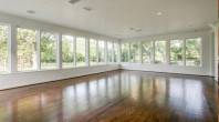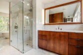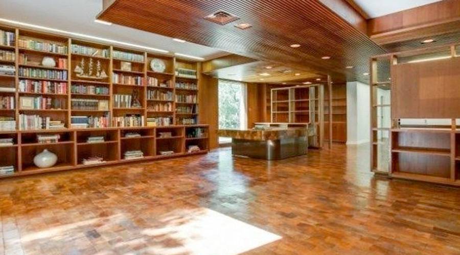 The home offers outdoor walkways, a truly exceptional library space (also tons of wood paneling), hardwood floors, marble bathrooms, modern kitchen, beautiful oval aboveground bathtub, pool and large modern windows.