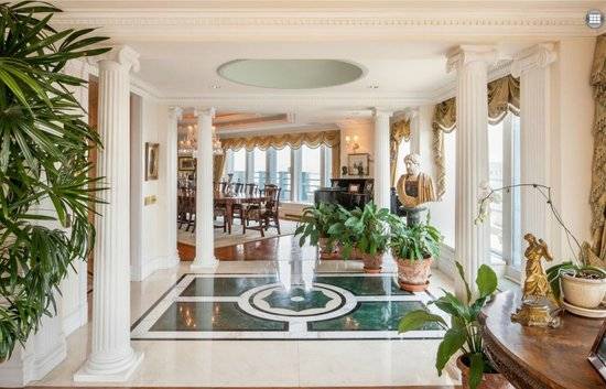 The penthouse features the design touch of Juan Pablo Molyneux, who recently listed his own New York property. His design includes a column-dominated foyer and a luxe chandelier in the dining room.