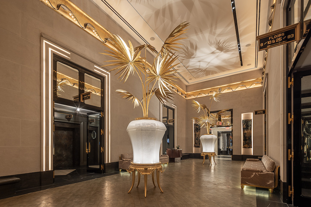From lighting fixtures to sculptures and other installations, the building boasts 30 bespoke pieces made by LASVIT in North Bohemia. The private porte-cochere includes two of its custom chandeliers, designed by Studio Sofield to reference the charm of original pieces installed in the early 1920s. Moving into the lobby, guests and residents will stand awe-struck by two 30-foot-tall crystal urns adorned with bronze palm leaves. The 880-pound wonders were created using LASVIT’s special grinding technology to align and fuse their individual glass pieces seamlessly. Gracing the building’s South Oval, an installation of ebonized bronze trees formed from special blackened metal gives an organic, yet polished feel. Evocative lighting installations from LASVIT’s Senior Designer Jana Růžičková are interspersed throughout the building, weaving these moving parts together.