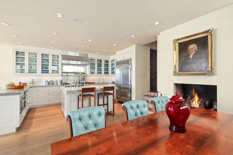 The kitchen is equipped with a large island, six-burner Viking stove with a grill and griddle, and Sub-Zero built-in refrigerator.