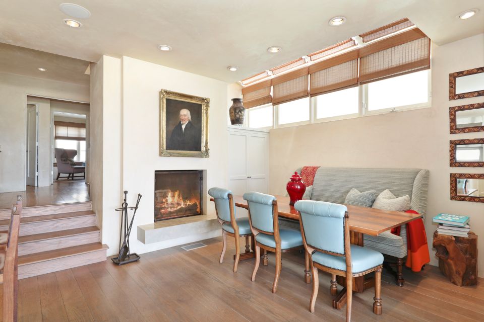 On the second level, the master suite boasts a sitting area with a fireplace, two closets, a master bathroom, and an attached sundeck, as well as vast views of the ocean and Catalina Island.