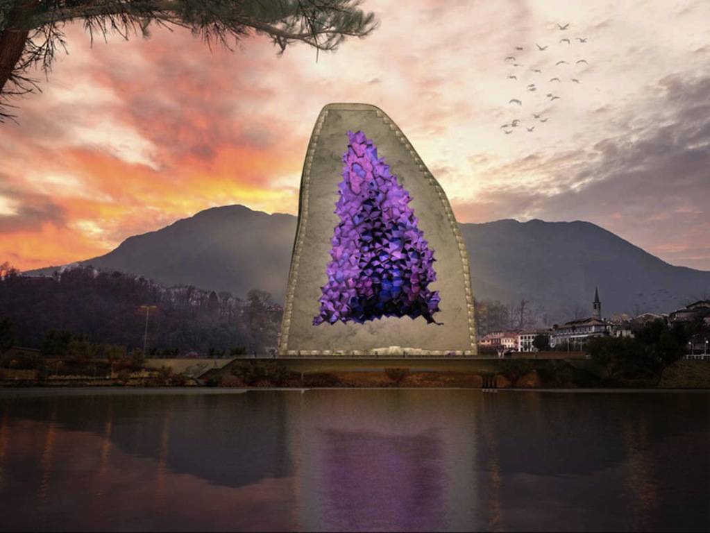 These quartz buildings are cut in half to reveal a purple crystalline surface. The hotel rooms are clustered in the center of the tall tower and will be faced with geometric, crystal-like glass tinted purple. This arrangement allows every room to enjoy panoramic views and an abundance of natural light, while invoking the healing qualities of amethyst.