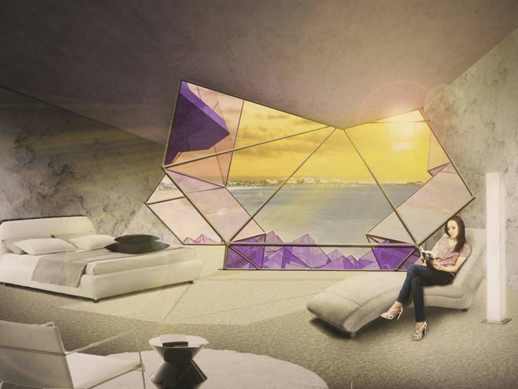 Ocean Flower, China is a suitable choice for the site of the first hotel, as the amethyst holds an important place in the Chinese art of feng shui. The chunky crystalline room windows are not only meant to reinforce the symbolic aesthetic of the hotel, but to present a contrast with the smooth exterior. The cathedral-like appearance of the building is meant to evoke feelings of grandeur and a welcoming sense of hospitality.