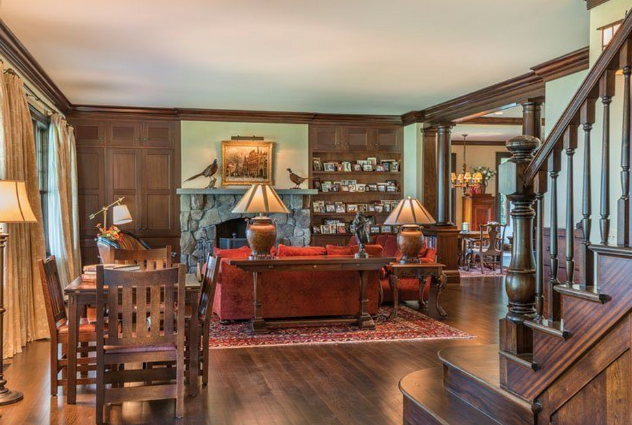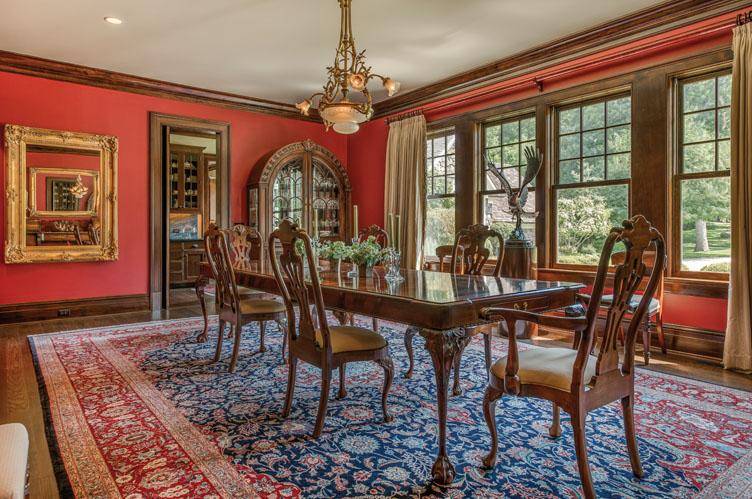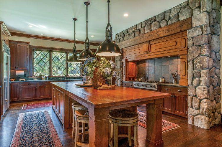 The sizeable house’s classic kitchen also touts splendid wooded detailing and a stone facade.