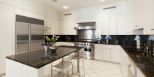 A private entry vestibule with custom shelves and woodwork; a custom-outfitted dressing room; and a spa-like limestone bathroom with a double sink vanity, a separate dressing vanity, a steam shower enclosed in glass, and a soaking whirlpool tub can all be found in the master bedroom suite. There’s a large eat-in-kitchen with Blue Pearl granite countertops, both Viking range and Subzero refrigerators, and a wine cooler.