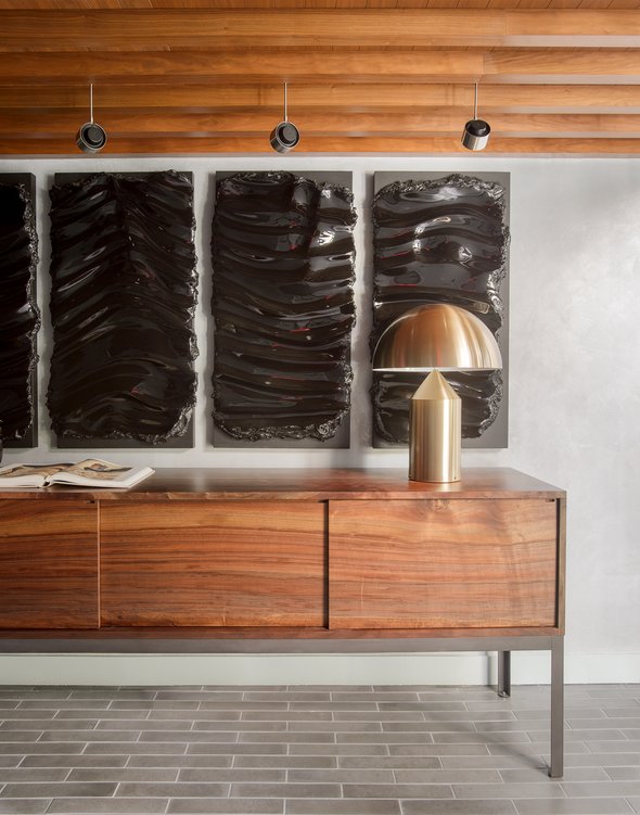 DXA studio was tapped to design the lobby, residential and amenity spaces at 242 Broome, the first condominium within Manhattan’s Lower East Side’s Essex Crossing development. Here, DXA aimed to create interiors that merge the gritty quality of the Lower East Side with a residential experience that is elegant and refined. The team took inspiration from the building’s exterior and vibrant surroundings to create rooms that are not only sleek and livable, but also reflect the neighborhood’s character. The metalwork seen around the Lower East Side in the form of vault lights, diamond plate, storefronts and manhole covers became a source of inspiration for DXA studio, while materials such as patterned blackened steel and polished concrete are balanced with warm wood panels to envelop the public spaces. 242 Broome also features a champagne-colored façade of anodized aluminum—designed by SHoP Architects—that derives its warm color palette from the neighborhood. Inside, abstract geometric panels that echo the façade’s design are found on a lobby wall, as well as on casework in the entertaining lounge.