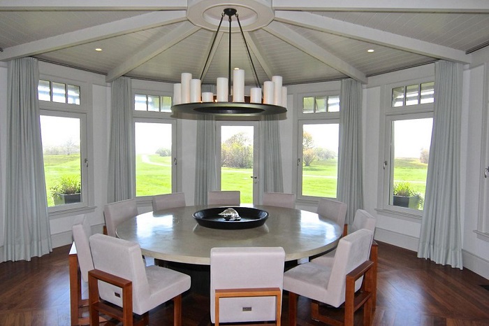 As for the sprawling estate’s interior, highlights include multiple seating and entertaining spaces, a modern chef’s kitchen, and a formal circular dining room surrounded by a wall of windows overlooking the grounds. The listing continues, “The spacious and dramatic living room space boasts vaulted ceilings with exposed steel beams and a focal point stone fireplace. There are two guest wings and an impressive master suite with fireplace, private sun deck and spectacular water views.”